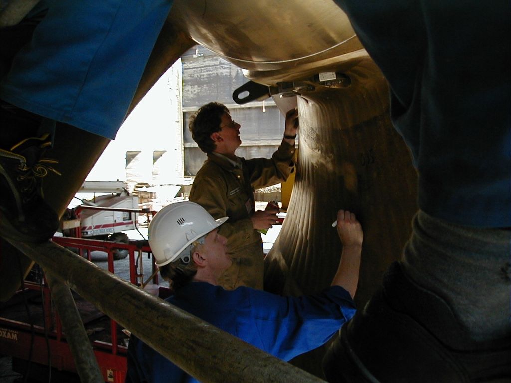 Die Aufzeichnung hat perfekt funktioniert, wie sich nach dem Ausbau im September herausstellte. Allerdings haben die meisten Sensoren und Kabel trotz intensiver Vorversuche des Kunden nicht standgehalten. Der Propeller dreht mit seinen ca. 6 Metern Durchmesser bis zu 180 U/min, eine gewaltige Belastung ergibt sich in der Strömung! Nicht beachtet wurde beim Manövrieren, dass der Rückwärtslauf der Propeller im Hafenbecken die Kabel gefährdete. Eine Messstelle an der Propellernabe, die naturgemäß weniger beansprucht war, und die bis zuletzt gehalten hat, zeigte, dass die Logger wie gewünscht gearbeitet haben. Selbst die Sorge bezüglich Dichtigkeit des Gehäuses erwies sich als unbegründet. Das trotzdem traurige Ergebnis sollte zu einer Wiederholung der Messung führen, mit noch unbestimmtem Termin...